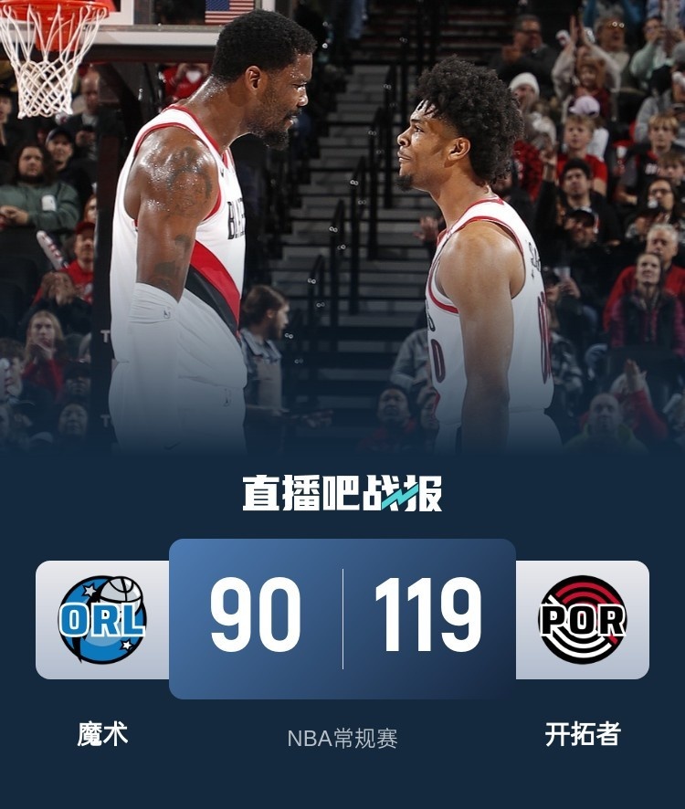 艾顿22+8 亨德森23+7 小瓦格纳24分 开拓者3人20+击败魔术