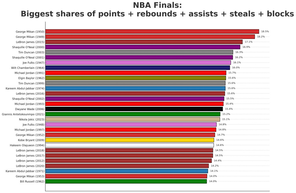 总决赛综合贡献值排序:麦肯包揽前二 詹姆斯6次 乔丹&鲨鱼3次