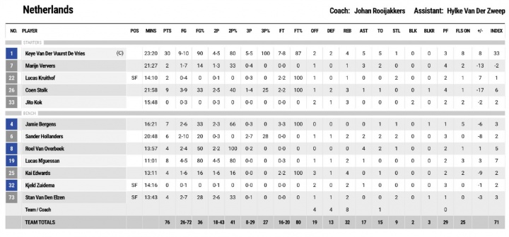 男篮拉练首场公开比赛击败荷兰官方数据:全队多达22次失误