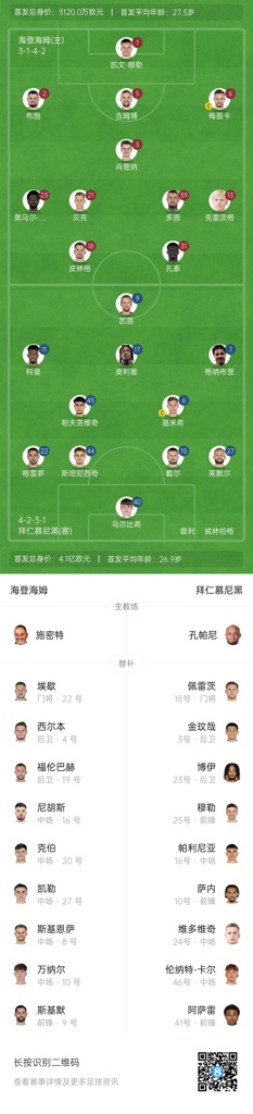 拜仁首发:40-乌尔比希、15-戴尔、22-格雷罗、44-斯坦尼西奇、6-基米希、27-莱默尔、45-帕夫洛维奇、7-格纳布里、11-科曼、17-奥利塞、9-凯恩