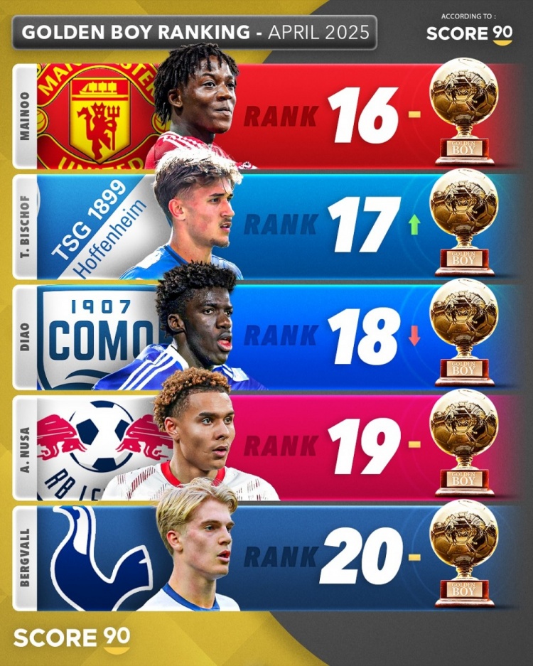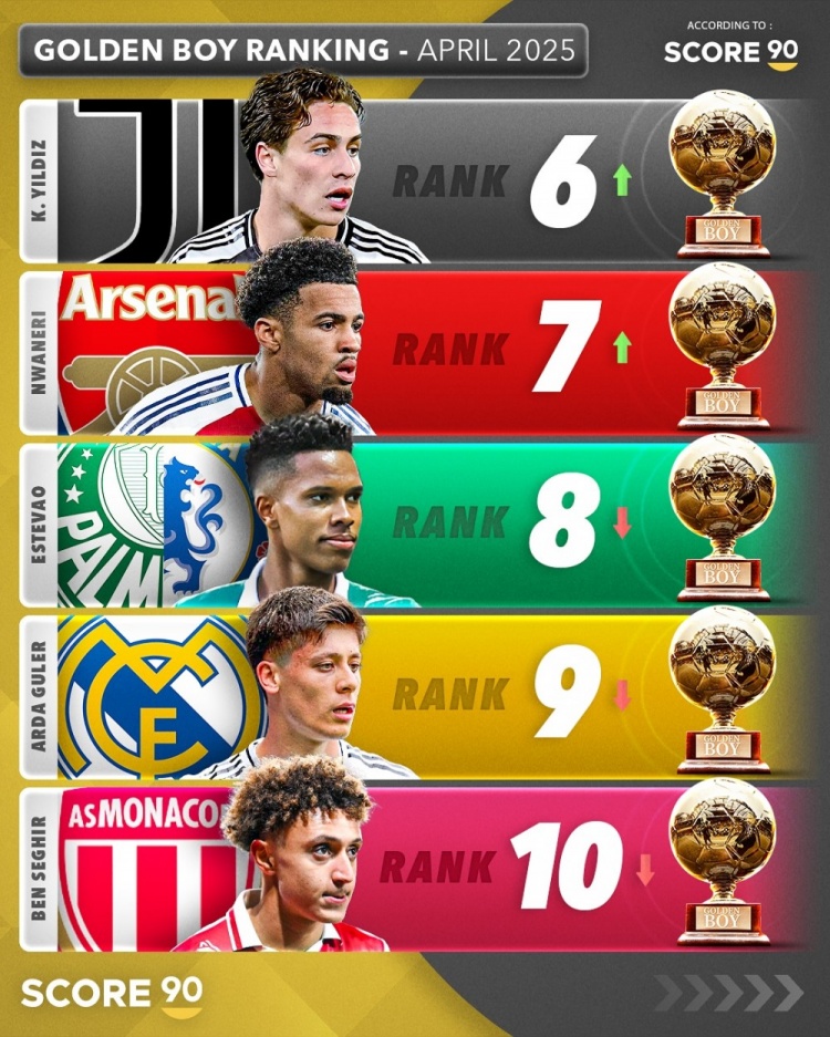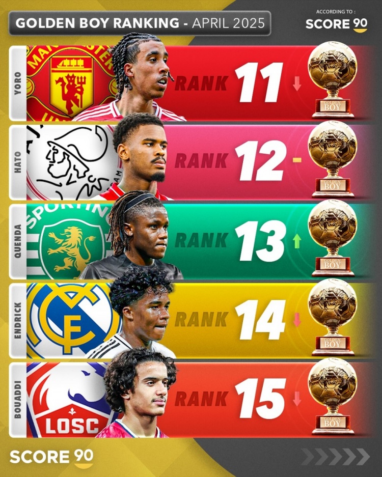 4月19日讯 Score90列出了2025年金童排名,巴黎边锋杜埃居首,库巴西、扎伊尔-埃梅里二三位。