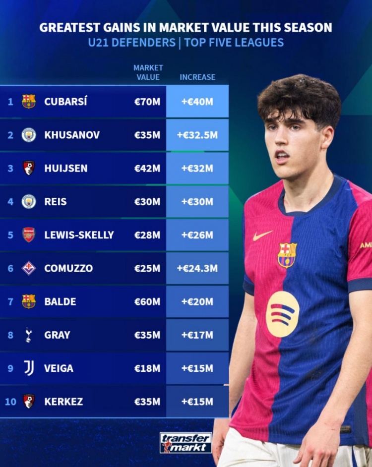 五大联赛U21后卫身价上涨排行:库巴西+4000万欧居首 胡桑诺夫第二