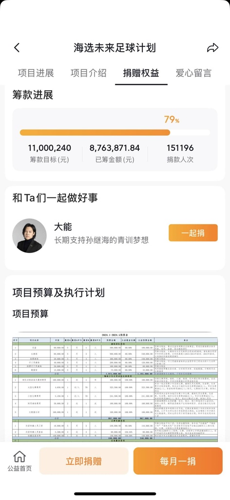 扬子晚报/紫牛新闻记者注意到,目前孙继海在平台为“嗨球”青训募集公益资金,筹集2024年6月-2025年5月的费用,已有15.1万人捐赠超过800万元,已经达目标金额1100万的79%。