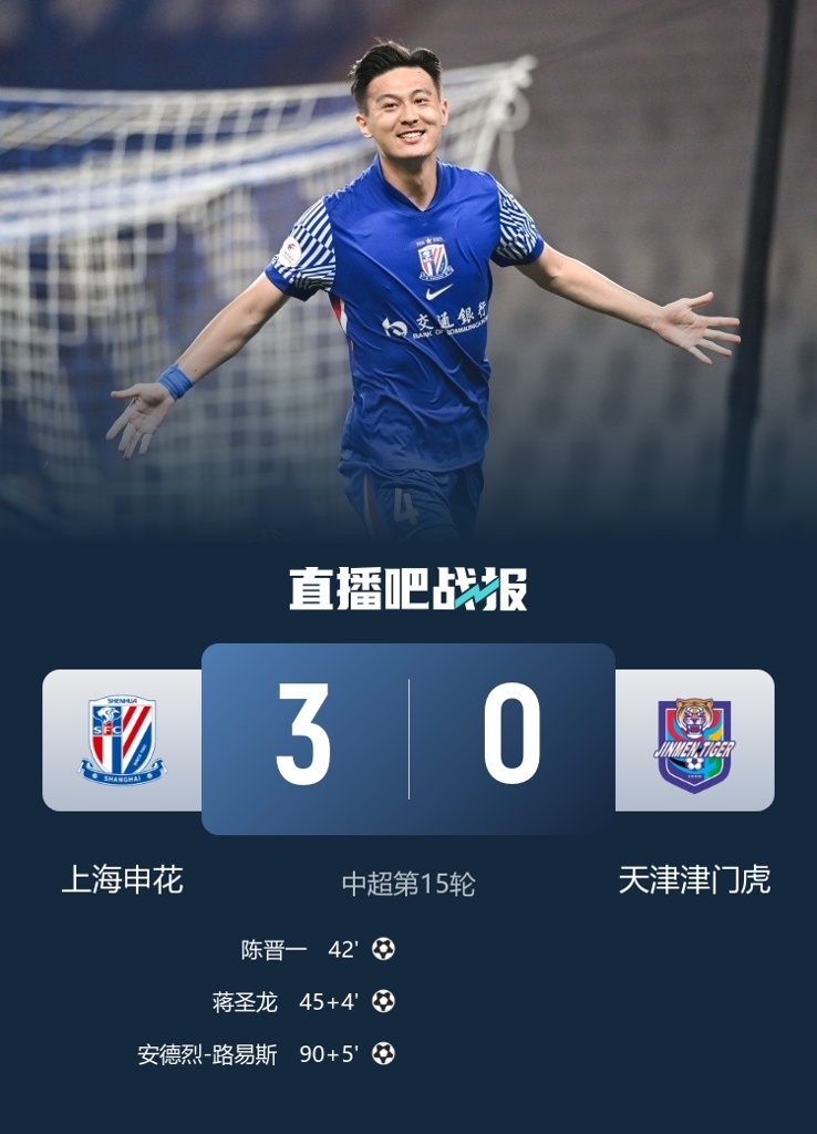 全场比赛结束,上海申花主场3-0完胜天津津门虎。