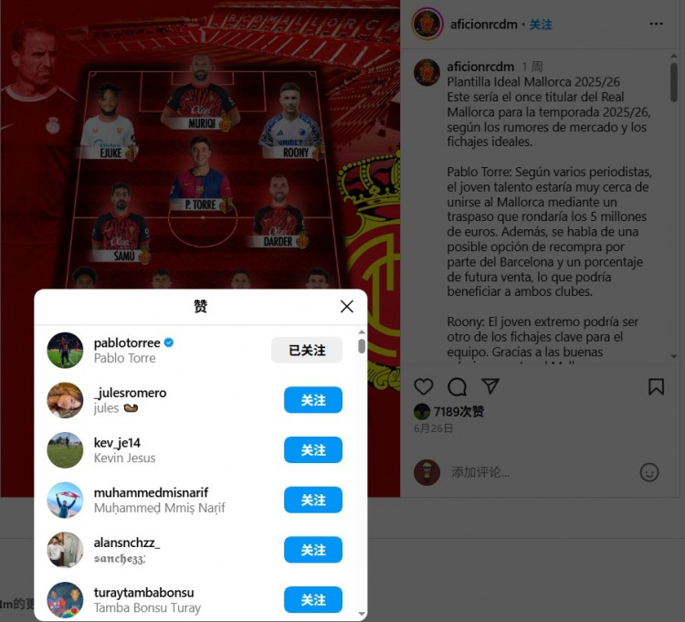 转会在即!巴萨中场托雷社媒点赞自己加盟马洛卡的相关动态