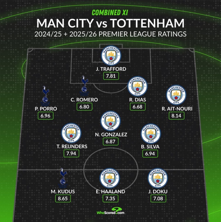 WhoScored曼城+热刺阵容: