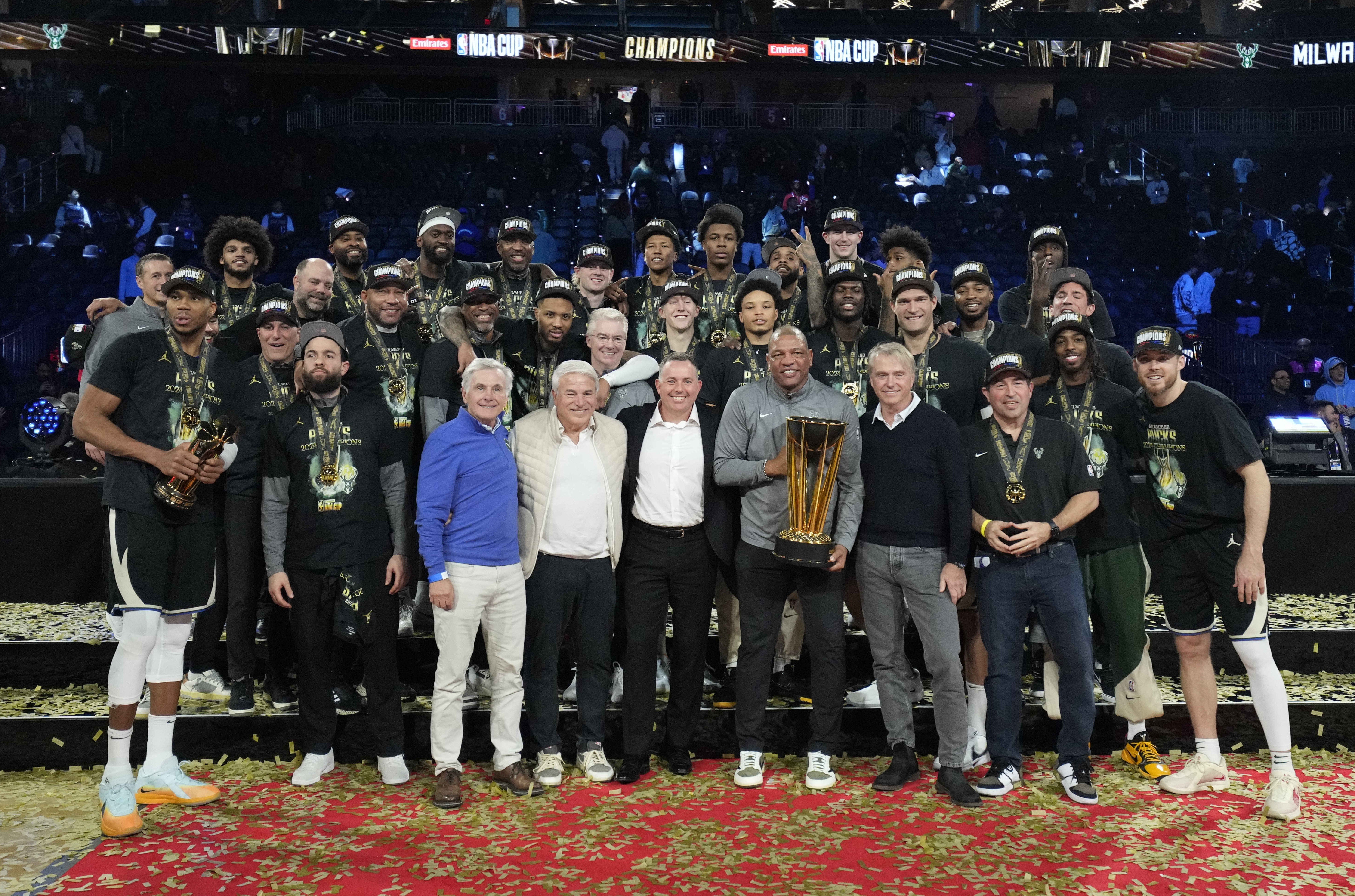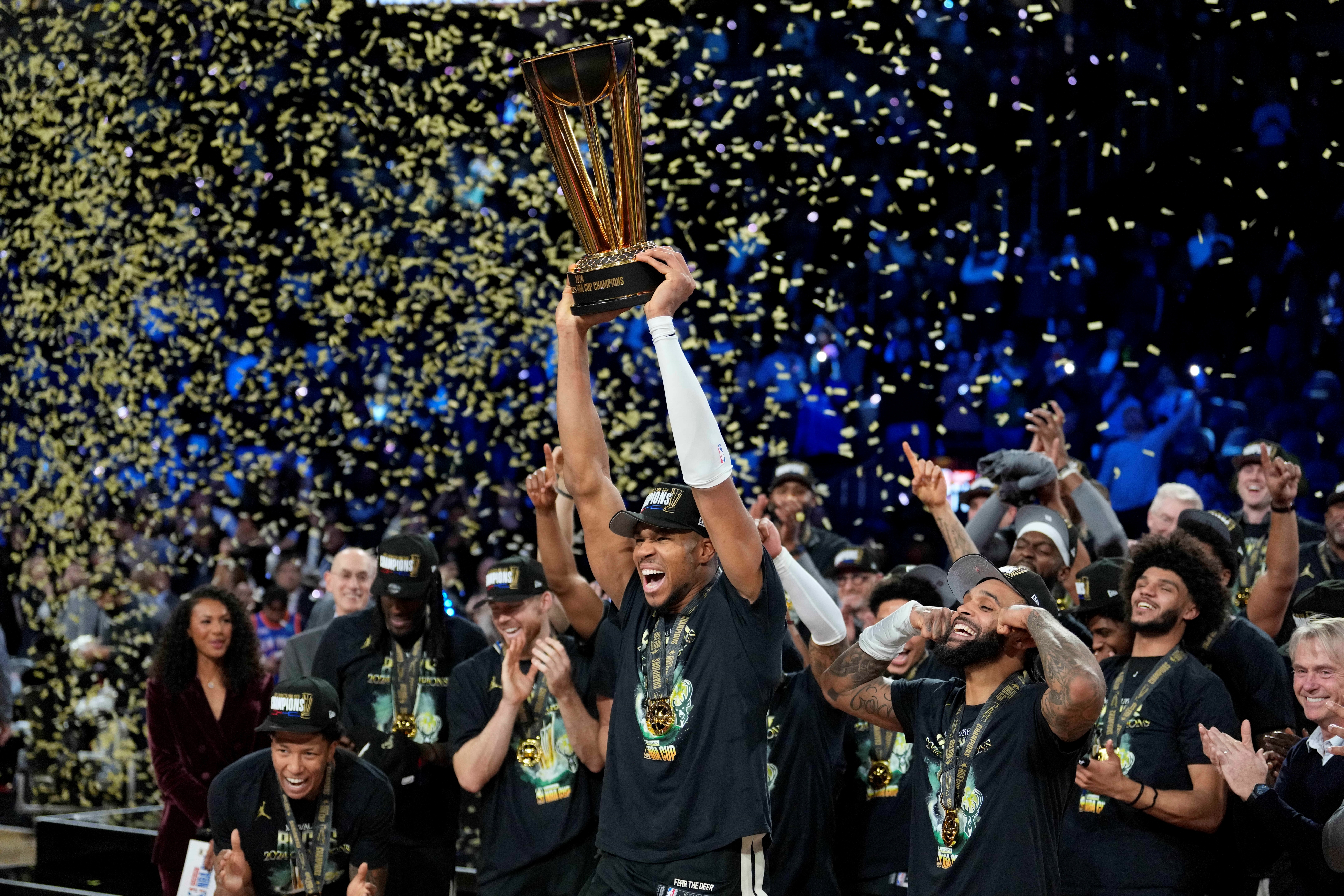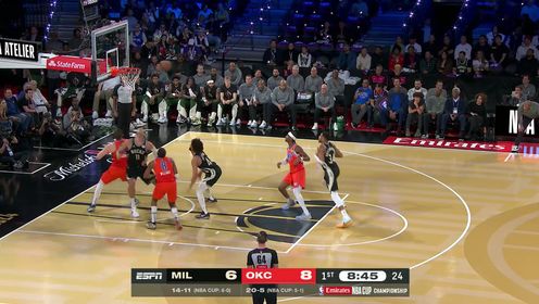 首节之争双方僵持对攻势均力敌,雷霆开局短暂拉开7分优势但很快被赶上,而卡鲁索的极限压哨进球也因稍稍超时被吹掉;次节双方持续拉锯最大分差不过4分,后半段的差距更是局限在一个球上;双方的主要进攻还是来自于各队核心,不过雷霆整个上半场三分球17投1中的情况下仅仅落后1分进入下半场。休息归来雷霆外线状态依旧不佳,这也导致内线被压缩局面越加被动,尤其是第三节最后4分钟里仅得4分成为压垮他们的稻草;雄鹿则在开局就送出18-7的攻势一举拉开两位数分差,末节开局又对着雷霆“伤口撒盐”上来就是4记三分直接拉开20分的优势奠定胜局。最终,雄鹿击败雷霆夺得本年度NBA杯的冠军。
