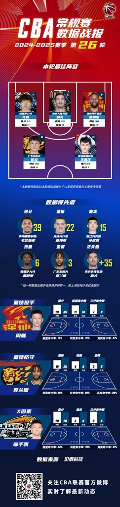 2024-2025赛季CBA联赛常规赛第26轮结束较量,来自新疆广汇篮球俱乐部的齐麟 、南京同曦篮球俱乐部的利夫、深圳新世纪烈豹篮球俱乐部的威姆斯、广东宏远篮球俱乐部的徐杰和青岛国信海天篮球俱乐部的王睿泽入选CBA联赛常规赛第26轮最佳阵容!