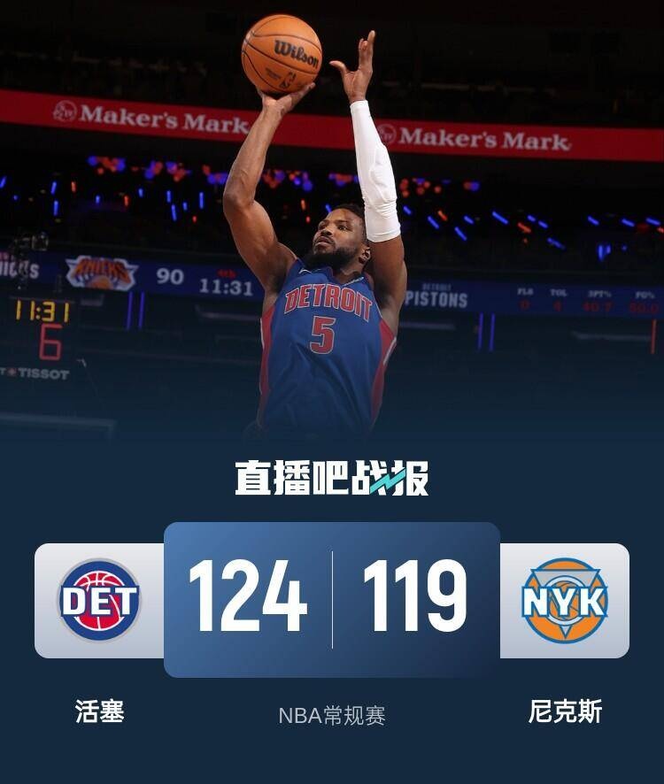 比赛开始,尼克斯进攻端受背靠背体力影响很慢热,首发五虎状态一般,但活塞年轻人很兴奋,比斯利单节4记三分拉开比分,斯图尔特强打2+1后活塞领先11分,次节尼克斯上来7-0追分,随后活塞进攻端有些停滞,佩恩接连三分,布伦森里突外投单节得分上双,带队半场反超4分。下半场,尼克斯进攻端又不在状态,而上半场受犯规影响的康宁汉姆开始发力,上来连砍11分,最终单节砍下18分带队反超比分,末节双方命中率都有下降,但活塞始终保持住两球以上领先,布伦森接连突破强打继续咬住比分,CC强突能回应,比赛进入白热化,比斯利接连两记三分杀死比赛,最终活塞124-119险胜尼克斯。