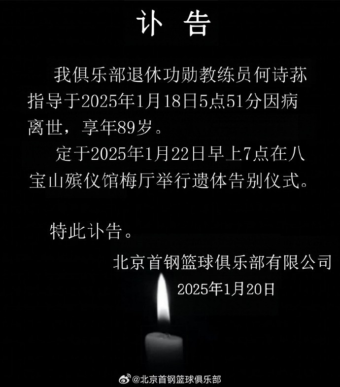 我们怀着悲痛之情,告知大家:中国篮球名宿,北京篮球功勋球员、教练员何诗荪先生,于2025年1月18日5点51分因病辞世,享年89岁。北京首钢篮球俱乐部不胜悲恸,深表悼念!