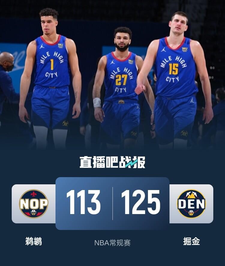 首节之争掘金虽然在主力对决中占不到便宜,但随着轮换开启他们迅速接管比赛,末段约基奇继续留在场上并带队送上一波14-5的攻势拉开两位数分差;次节场面和首节相差不大,掘金在和鹈鹕纠缠半节后再度接管比赛,后半段一波14-3的攻势继续扩大领先并奠定半场18分领先。休息归来掘金没能像上半场那样掌控比赛,尤其是后3分30秒直接哑火被鹈鹕打了一波10-0的攻势缩小分差;末节鹈鹕继续紧追比分保留希望,不过掘金顶住压力并在末段稳定输出一直维持着10分左右的分差保持到最后。最终,掘金力克鹈鹕拿下比赛,并送鹈鹕6连败。