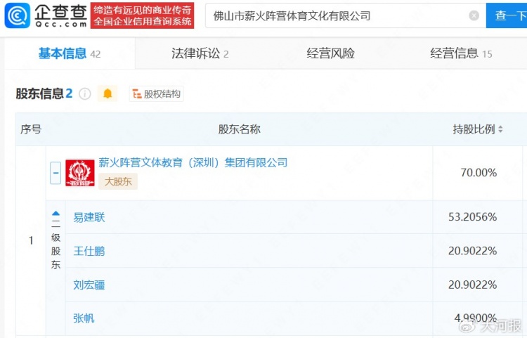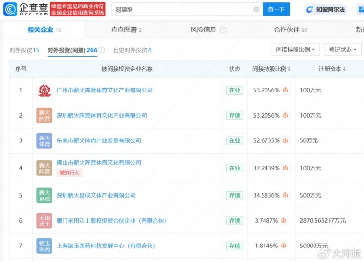 企查查APP显示,易建联关联15家企业,其中12家为存续状态,包括薪火阵营文体教育(深圳)集团有限公司、上海壹球成名信息技术有限公司等。此外,易建联间接持股企业超200家,行业涉及除体育文化外,还包括商贸、科技、投资等领域。今年2月,易建联关联企业佛山市薪火阵营体育文化有限公司成被执行人,执行标的约12万元。
