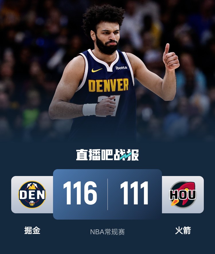 首节开打后掘金手感冰凉,主场作战的火箭轰出7-0开局,穆雷连投带罚及时止血,首节结束时两队战成27平,次节回来,双方你来我往继续僵持,格林里突外投率队取分,掘金多点开花总能给予回应,半场战罢,双方57平难分伯仲。易边再战后火箭进攻出现停滞,穆雷连中三分单节狂揽15分,率队连续打出小高潮拉开比分,三节结束后掘金已经领先17分,末节上来,决胜时刻火箭一波7-2拉回悬念,穆雷和小波特连中罚球,申京和格林连丢罚球反扑未果,最终掘金116-111击败对手终结连败,同时终结火箭9连胜。