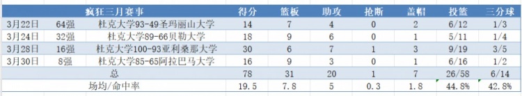 加入杜克大学后,作为新生的库珀-弗拉格依然光芒四射。在疯狂三月的征途中,弗拉格用肆意挥洒的篮球天赋再次证明着自己,4场比赛库珀-弗拉格场均19.5分7.8篮板5助攻1.8盖帽,三项投篮命中率分别为44.8%、42.8%、87%,是本次锦标赛中唯一一位得分、篮板、助攻榜均进入前十的球员。
