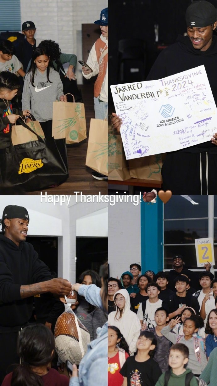 11月29日讯 今日,湖人球员范德比尔特更新INS,晒出了参加感恩节回馈社区的活动。
