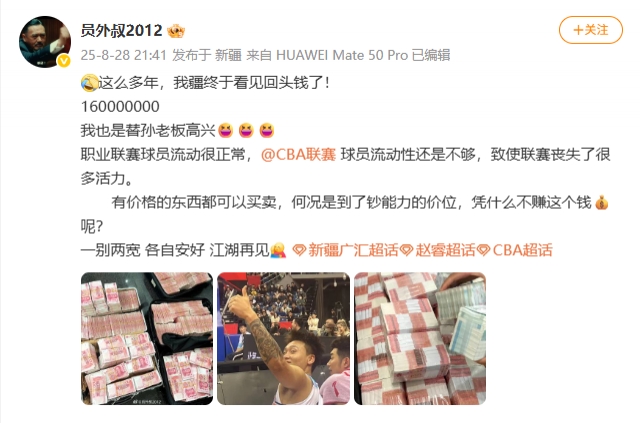 新疆体育博主@员外叔2012晒出赵睿以及一堆钞票的图片,透露新疆拿到了1.6亿人民币,原文如下: