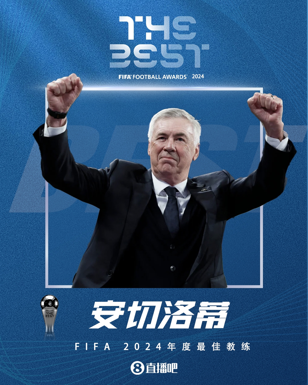 FIFA年度颁奖,官方公布了年度最佳教练获得者,安切洛蒂当选。