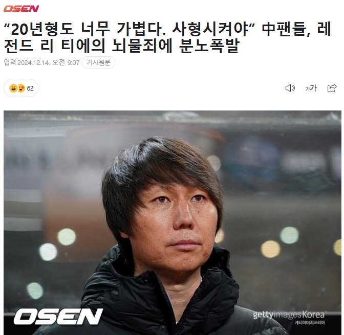 12月14日讯 昨日湖北省咸宁市中级人民法院一审对原国足主帅李铁判处有期徒刑二十年,韩媒OSEN继续关注该案件。