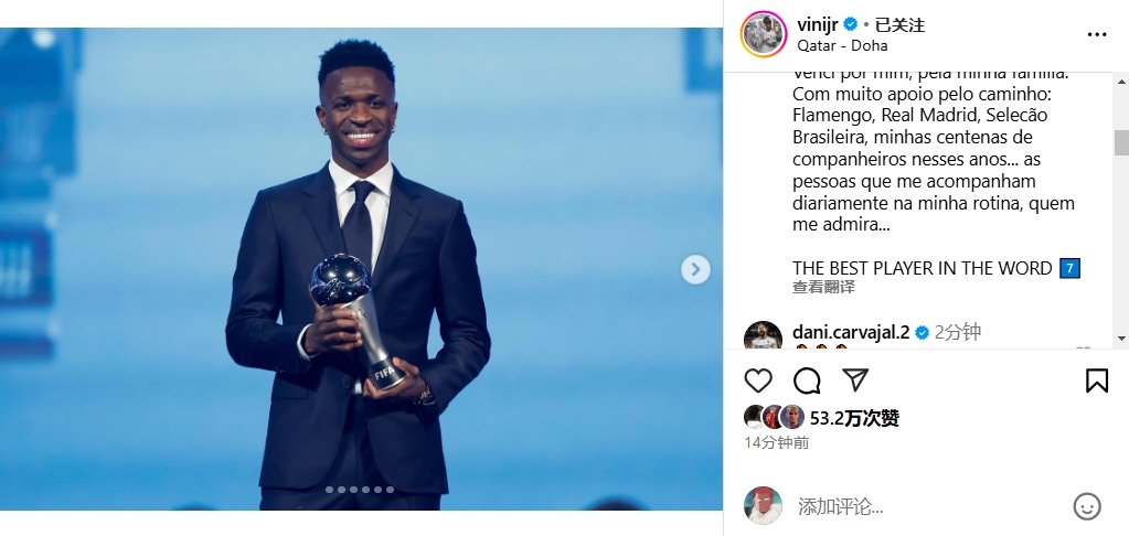 “我为自己而赢,为我的家人而赢。在这条路上,得到了许多支持:弗拉门戈、皇家马德里、巴西国家队,这些年来我数不清的队友……每天陪伴我的人,崇拜我的球迷……”