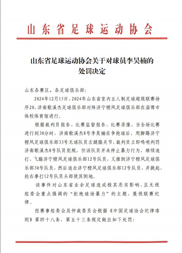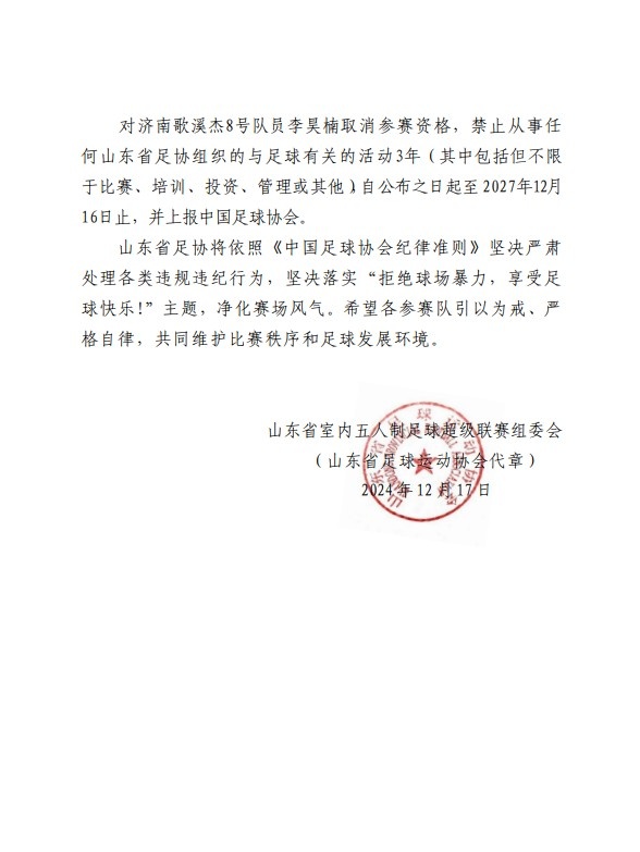 经赛事组委会及仲裁委员会根据《中国足球协会纪律准则》第四十八条、第五十三条规定做出如下处罚:对济南歌溪杰8号队员李昊楠取消参赛资格,禁止从事任何山东省足协组织的与足球有关的活动3年(其中包括但不限于比赛、培训、投资、管理或其他),自公布之日起至2027年12月16日止,并上报中国足球协会。山东省足协将依照《中国足球协会纪律准则》坚决严肃处理各类违规违纪行为,坚决落实“拒绝球场暴力,享受足球快乐!”主题,净化赛场风气。希望各参赛队引以为戒、严格自律,共同维护比赛秩序和足球发展环境。