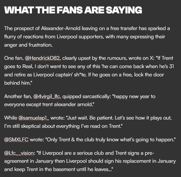 1月1日讯 2025冬窗开启,利物浦球星阿诺德与球队的合同仅剩半年,目前双方仍没有续约的迹象,而皇马对阿诺德的追求也早已不是秘密。国外一些红军球迷对阿诺德的态度极为不满。