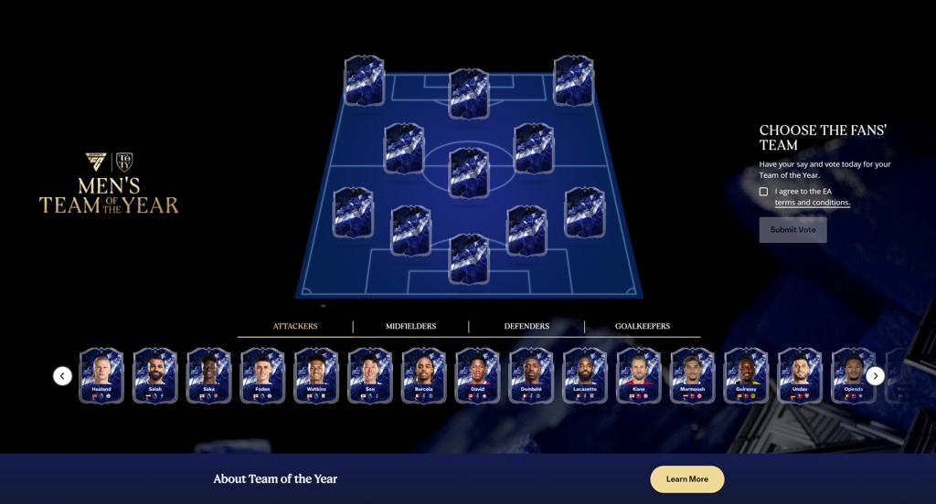 顶尖提名者们,他们都在争夺今年首发11人的一个席位。最终的年度最佳球队阵容将在投票结束后不久公布,并将特别发布TOTY球员卡到FC25游戏中,以庆祝每一位粉丝最爱的球员的地位。