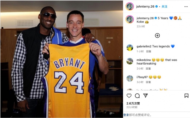 1月28日讯 今日,切尔西传奇队长特里在社媒发文,缅怀已故前NBA巨星科比-布莱恩特。