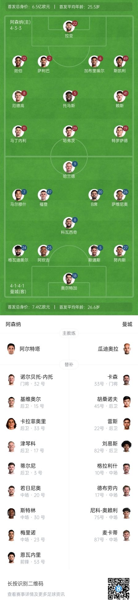 阿森纳vs曼城首发:哈弗茨、斯凯利先发,哈兰德、马尔穆什出战