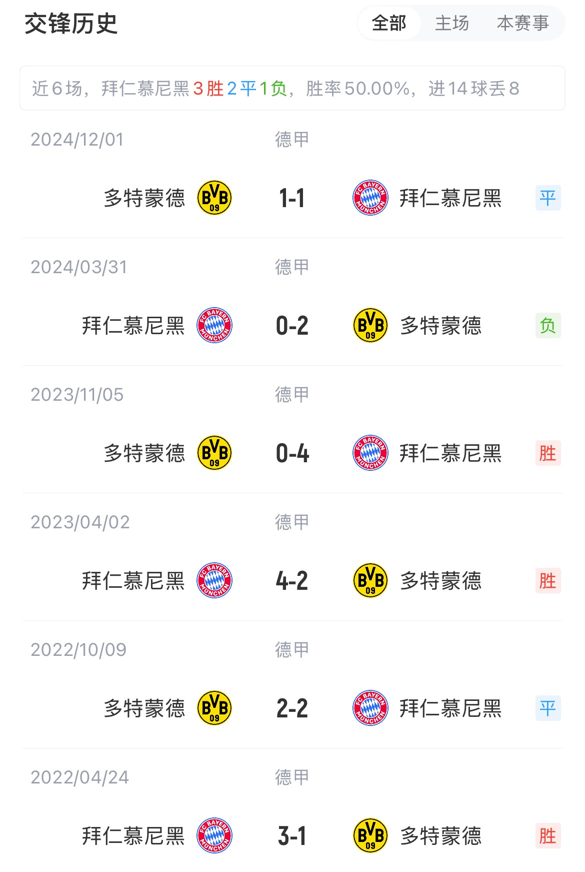 拜仁目前以68分领跑积分榜,领先先赛勒沃库森5分。多特暂以41分排在第八。两队赛季首次对阵中,拜仁客场1-1战平多特。