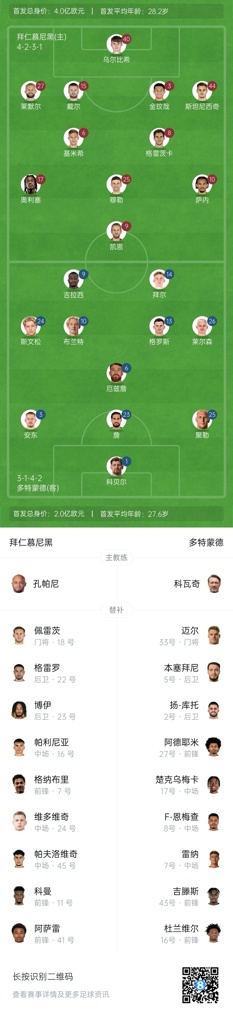 04月12日讯 德甲第29轮,拜仁主场对阵多特,赛前首发公布。