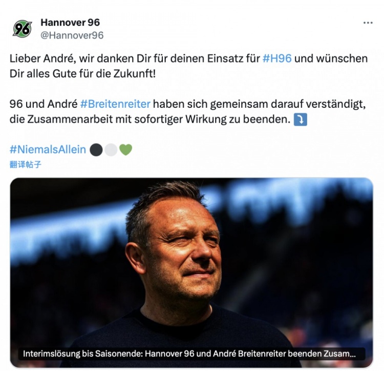 4月23日讯 当地时间本周三,德乙球队汉诺威96官方宣布与主帅布赖滕赖特即刻终止合作。