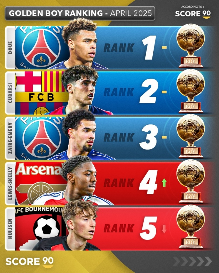 4月19日讯 Score90列出了2025年金童排名,巴黎边锋杜埃居首,库巴西、扎伊尔-埃梅里二三位。