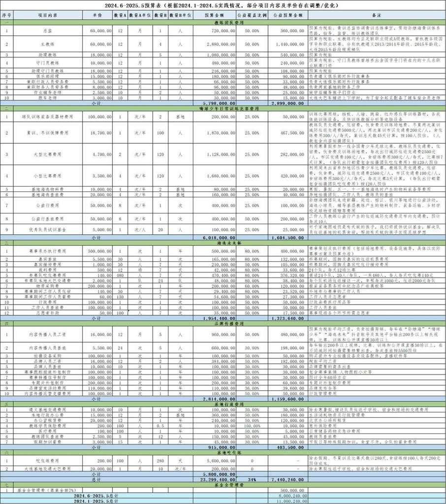 该项目预算表显示,球队有4名主教练,每人税前月薪6万元,此外还有总监、助理教练、守门员教练、助理守门员教练等,在这个周期内单是教练团队预算就接近600万,其中公益预算金额承担一半。