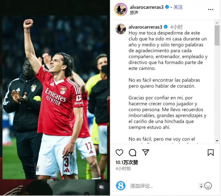A费在社交媒体上发文,与本菲卡告别:“今天,我不得不告别这个在过去一年半的时间里如同家一般的俱乐部。我只想对每一位队友、教练、员工和管理层成员表达最深切的感谢,感谢你们陪伴我走过这段旅程。