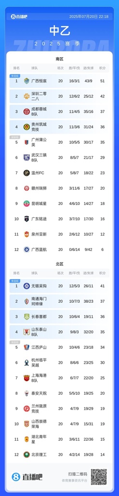 7月20日讯 中乙第20轮结束争夺,上海海港B队2-0山东泰山B队,广西蓝航0-2深圳二零二八依旧难求一胜。