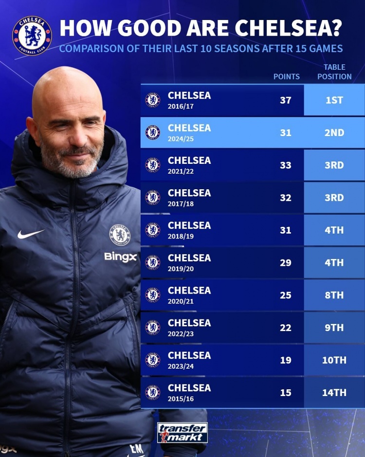 12月9日讯 英超前15轮比赛战罢,切尔西9胜4平2负积31分,排名积分榜第二位,据德国转会市场统计,这是切尔西近10个赛季同期第二高排名。
