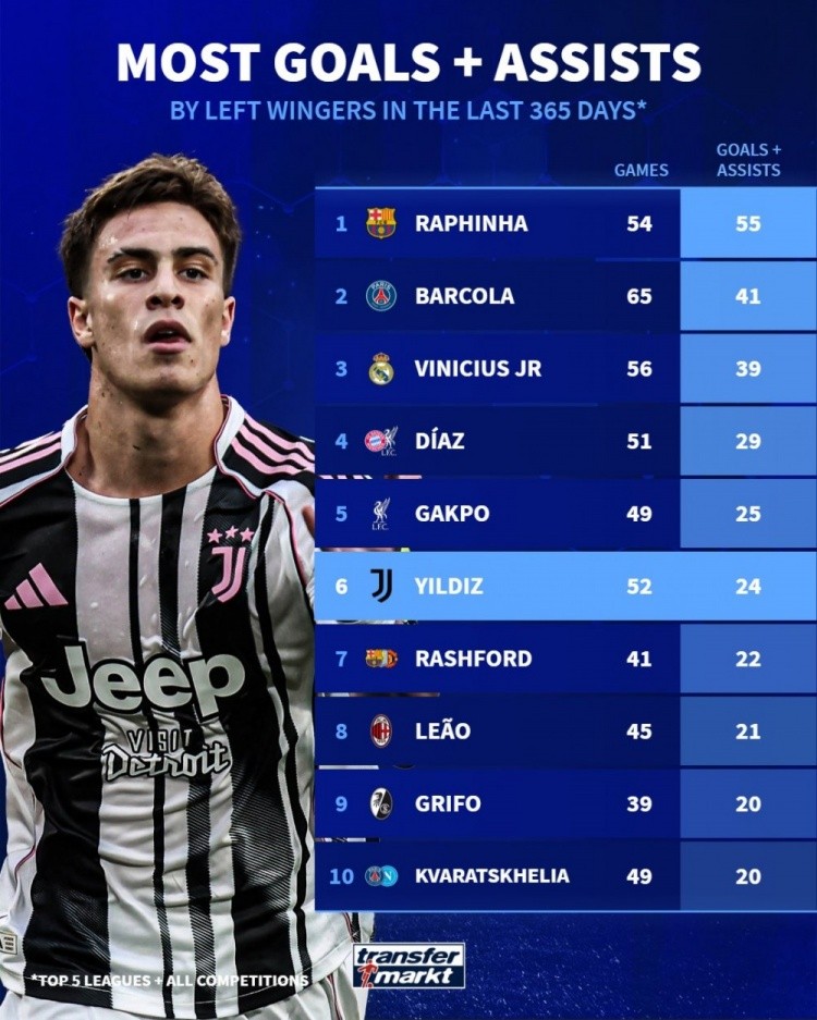 10月6日讯 德国转会市场统计了五大联赛左边锋过去一年各赛事的参与进球数量,拉菲尼亚参与55球居首,伊尔迪兹参与24球排名第6位,值得一提的是,伊尔迪兹的德转身价将在明天更新。